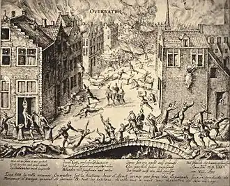 Count Willem IV van den Bergh, William of Orange's brother-in-law, captured the city of Zutphen, followed by other cities in Gelderland and neighbouring Overijssel.[27] In Friesland rebels had seized several cities.[27] The royalist stadtholder Caspar de Robles sacked Dokkum in reprisal, killing many citizens (Walloon Fury in Dokkum).[27] Louis of Nassau captured Mons by surprise on 24 May, but on 21 June Alba started besieging the city. William marched to Mons to support him, but a Spanish night raid on his camp forced Orange to withdraw through Mechelen, where he left a garrison. A French Huguenot army seeking to relieve Louis at Mons was also defeated in the Battle of Saint-Ghislain (17 July 1572) by Spanish forces under Philip of Noircarmes and Don Fadrique. Moreover, in the night of 23–24 August 1572, the St. Bartholomew's Day massacre was committed against the Huguenot leaders in Paris, crushing any remaining hopes of Calvinist reinforcements from the south.[2] Louis surrendered Mons on 19 September on the condition of an honourable withdrawal. On the other hand, Alba had troops sack Mechelen on 2 October, after which towns in the southern Netherlands hastened to pledge renewed loyalty to Alba.[28][29]