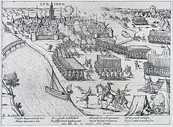 Flushing and Veere defected to the rebels on 3 May.[19] Orange quickly responded to this new development, by sending a number of emissaries to Holland and Zeeland with commissions to take over local government on his behalf, in his old capacity of stadtholder, which he now re-assumed.[22] Diederik Sonoy persuaded the cities of Enkhuizen, Hoorn, Medemblik, Edam, Haarlem, and Alkmaar to defect to Orange. The cities of Oudewater, Gouda, Gorinchem, and Dordrecht yielded to Lumey. Leiden declared itself for Orange in a spontaneous revolt. The States of Holland, with a rebel majority,[note 2] convened in the rebel city of Dordrecht,[23] and by 18 July, only the important cities of Amsterdam (until 1578) and Schoonhoven openly remained loyalist. Rotterdam went to the rebels soon after the first meetings in Dordrecht. Delft remained neutral for the time being.[24]