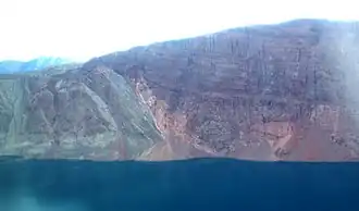 ![]() The southwestern side of Ella Island in August 2007. An onlap of Devonian sandstone (right) on folded Cambrian-to-Ordovician rocks (left) is visible. | |