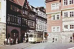 Eisenach was part of the GDR after 1949. The Inner German border ran only ten kilometres west of Eisenach and was closed in 1952, cutting off parts of Eisenach's traditional hinterland. The location near the border inhibited the further development during the next 40 years and the population declined through that period. Nevertheless, Eisenach remained an important industrial location. The BMW car factory was socialized and under the new name EMW produced the Wartburg, the so-called "Mercedes of the East". The deteriorating condition of many historic houses led to a housing shortage during the 1970s. The government fought this by demolishing some historic quarters (e.g. at Jakobstraße) and rebuilding them with Plattenbau settlements. The biggest Plattenbau district was built at the northern periphery of Eisenach between 1978 and 1985, with nearly 4,000 housing units. In 1975 the tramway system was discontinued.
