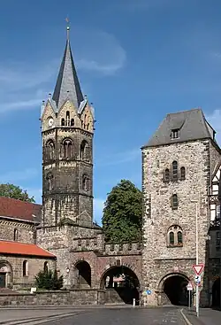 In 1080 the castle was first mentioned in a Saxon chronicle. Eisenach itself followed in a document dating to 1150, where it was referred to as "Isinacha".[5]: 139 During the 1180s the town was established by the construction of three independent market settlements around the Saturday market (today's Karlsplatz), the Wednesday market (today's Frauenplan), and the Monday market (today's Marktplatz). Due to its convenient location at a cross-roads between the Thuringian Forest in the south and the Hainich mountains in the north, Eisenach benefited from substantial east–west trade along Via Regia from Frankfurt to Erfurt and Leipzig, and became a rich merchant town. During the second half of the 12th century, the town walls were erected (the Nikolaitor is an important relict of this wall) and Eisenach got a planned grid of streets and alleys. In the late 12th century the Wartburg became the main residence of the Ludowingians, making Eisenach a leading place in today's western Thuringia and northern Hesse, which also belonged to the Ludowingian landgraviate. In 1207 the legendary Sängerkrieg supposedly took place at Wartburg castle.