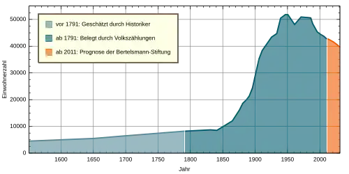 Eisenach has always been one of the larger towns in Thuringia, with 4,000 to 5,000 inhabitants during the Middle Ages. By 1800 the population rose to 8000 and further to 10,000 as industrialisation started around 1850. In 1875 the town had 16,000 inhabitants, and 30,000 in 1900, 43,000 in 1925, and more than 50,000 in 1940, the peak. Like most other east German mid-sized towns, Eisenach has had a shrinking population since 1950. It declined to 48,000 in 1990, 44,000 in 2000, and 42,000 in 2012. During 2009–2012 the annual change was −0.12%. Suburbanization played only a small role in Eisenach. It occurred after reunification for a short time in the 1990s, but most of the suburban areas are within the administrative town borders.