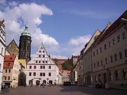 Market square in Pirna with St. Mary's Church, the Canaletto House and (r) House No. 10, 1472-1686 seat of the Eisenkammer
