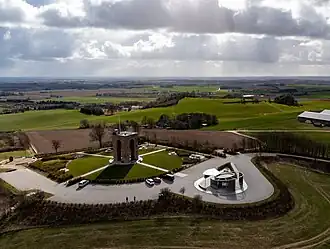 ![]() Ejer Bavnehøj and its tower as seen from the north east. Møllehøj is located just behind the partially visible farm buildings on the far right | |