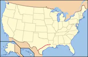 The historic trail ran from the capitol and central Viceroyalty of New Spain—present day Mexico City—winding through Saltillo, Monterrey, Laredo (on the modern Texas border), San Antonio, and Nacogdoches, before reaching the Louisiana border at the Sabine River. The river crossing was a ferry, in use since around 1795, as the Chabanan Ferry. James Taylor Gaines purchased the ferry in 1819, and it became known as the Gaines Ferry. Gaines sold the ferry in 1843 and at some point it began to be called Pendleton's Ferry.[4] The ferry remained in service until being replaced by the Gaines-Pendleton Bridge in 1937.