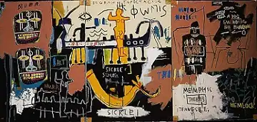 Throughout the rest of the painting, Basquiat highlights the "commercial exploitation of black people."[8] Images of the Atlantic slave trade are juxtaposed like hieroglyphics alongside images of the Egyptian slave trade centuries before. The repetition of the word "SICKLE" in the center panel is a direct reference to the slave trade in the United States, and slave labor under the plantation system. It may also refer to the illness sickle cell anemia, which is more common in African Americans in the United States compared to other ethnicities.[9] The word "SALT" that appears on the right panel of the work refers to the Atlantic slave trade, as salt was another important commodity traded at that time.[5] The phrase "EL GRAN ESPECTACULO" (the grand spectacle) stretched across the top of the painting, an "ironic commentary on a shameful, centuries-long tragedy."[1]