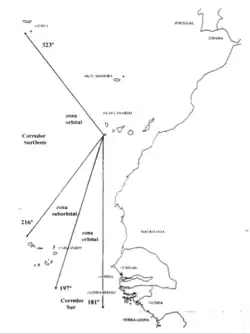 It would allow reaching a polar, heliosynchronous or geostationary orbit. The launch azimuth angles could be from 181° to 197° and from 216° to 323°.[4] Other angles would not be possible due to overflights from the other Canary Islands, Africa and Europe. However, angles between 160° and 181° could be used with the consent of African sovereignties.