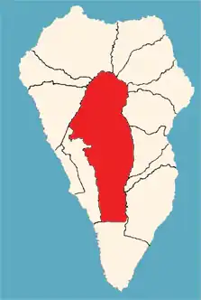 Geographically it is located in the center of the island of La Palma, covering to the west with the Caldera de Taburiente, part of the Aridane Valley, the Cumbre Nueva and the Cumbre Vieja. It is on the surface the largest municipality of the island, being the only one of the 14 municipalities of La Palma that lacks coastal strip. In 2016 it had a population of 7457 inhabitants.[3]
