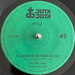 El derecho de vivir en paz (The Right to Live in Peace) is the sixth official single released by Chilean singer-songwriter Víctor Jara as a solo artist. It was written by Jara in 1969, as he worked in the "Vietrock" play by Megan Terry.[4] The song was released in 1971 by the Jota Jota label and was included in the El derecho de vivir en paz album, released later that year.