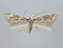 The wingspan is 8–10 millimetres (0.31–0.39 in).[1] The head is grey, face whitish. Forewings in male pale grey irrorated with black, in female blackish except on basal area; a somewhat oblique fascia before middle, a tornal spot, and triangular costal spot somewhat beyond it in male very indistinct, whitish, almost obsolete, in female broader, white, conspicuous. Hindwings are grey. The larva is pale yellowish-grey; head pale brown.[2][3][4]