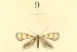 The wingspan is 7–9 millimetres (0.28–0.35 in).[2] The head is whitish. Forewings are whitish; costa towards base fuscous, with traces of a basal fascia; two broad partially ill-defined light yellow-ochreous fasciae in middle and at 3/4, more or less fuscous on costa, with some scattered black scales; dark line of cilia appearing truncate at apex. Hindwings are grey.[3]