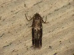 The wingspan is 7–8 millimetres (0.28–0.31 in).The head is dark grey, whitish-sprinkled, face paler or whitish. Forewings are blackish, somewhat paler-sprinkled; an oblique fascia before middle, in male indistinct and sometimes interrupted, a tornal spot, and an opposite costal spot (appearing together to form a perpendicular interrupted fascia) whitish, in female whiter and more distinct. Hindwings are grey. The larva is pale yellowish-grey; head black or pale brown; 2 with two black spots[2][3][4]