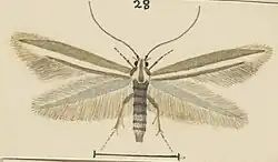 ♂. 12–15 mm. Head white, a grey median stripe. Palpi white. Thorax grey, a white stripe on each side of back. Forewings narrow-lanceolate; grey; costal area variably tinged or suffused white; a white subdorsal streak from base to tornus, leaving a narrow grey dorsal streak; cilia white, towards tornal area tinged grey. Hind-wings grey; cilia whitish-grey.[3]