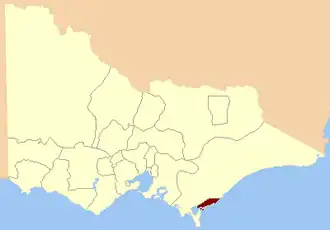 Its area was defined as: "Commencing at the Mouth of Worrigall Creek on the Ninety Mile Beach Bounded on the North by a Line West Seventeen Miles to the Eastern Branch of the River Tarra; thence on the South-west by a Line in a South-westerly Direction to the Mouth of the Little River in Corner Inlet; and on the South and South-east by the Sea coast (including Snake Island) to the commencing Point".[2]