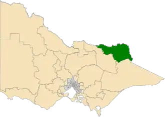 The electoral district of Benambra is one of the electoral districts of Victoria, Australia, for the Victorian Legislative Assembly. It covers an area of 10,037 square kilometres (3,875 sq mi)[1] in north-eastern Victoria. The largest settlement is the city of Wodonga. Benambra also includes the towns of Baranduda, Barnawartha, Beechworth, Chiltern, Corryong, Eskdale, Kiewa, Mitta Mitta, Mount Beauty, Rutherglen, Tallangatta, Tangambalanga, Tawonga, Wahgunyah, and Yackandandah. It lies in the Northern Victoria Region of the upper house, the Legislative Council.[1]