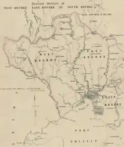 The district of East Bourke was one of the initial districts of the first Victorian Legislative Assembly, 1856.[2]