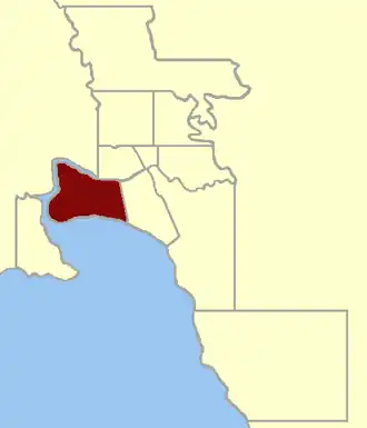 Commencing at the junction of the River Yarra and the Saltwater River; thence by the River Yarra to a point due south of the Gas Works; thence by a line south-easterly to a point on the shores of Hobson's Bay, twenty chains more or less westward of the Battery ; thence by the sea coast and the River Yarra to the commencing point.[2]
