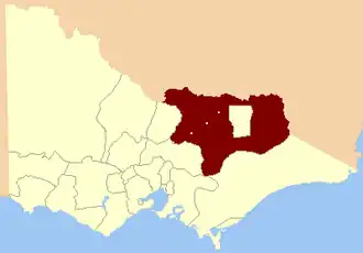 It was based in north-eastern Victoria, south of the Murray River.[2] Its area was defined in the Victoria Constitution Act 1855 (18 & 19 Vict. c. 55) as: "Bounded on the South and West by the Counties of Evelyn and Anglesea and the River Goulburn to its Junction with the River Murray; on the North and North-east by the River Murray; and on the East by the great dividing Range, excepting the Country comprised in the Electoral Districts of the Murray Boroughs and of Beechworth" (Ovens).[3]