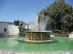 The surrounding 30 foot (9.1 m) diameter pool is edged with ceramic tile. Terra cotta mosaic pavement tiles show images from the early history of the area and the founding of the city.[1]