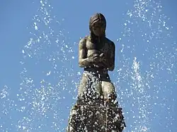 Robert Merrell Gage placed the 6-foot (1.8 m) granite sculpture of a Tongva/Gabrieleno tribe member, kneeling in prayer, on a 20-foot (6.1 m) stone column. According to Peter James Holliday, the image was "said to be modeled after Gradin Newsom, who was part Cherokee".[4] The sculpture sits in the center of the smaller circular raised fountain.