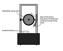 Electrochemical grinding is a process that removes electrically conductive material by grinding with a negatively charged abrasive grinding wheel, an electrolyte fluid, and a positively charged workpiece.[1] Materials removed from the workpiece stay in the electrolyte fluid. Electrochemical grinding is similar to electrochemical machining but uses a wheel instead of a tool shaped like the contour of the workpiece.