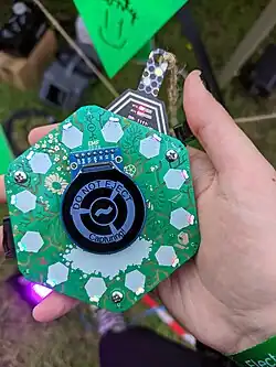 Attendees of EMF receive an electronic conference badge, funded by sponsorship, which in 2014 included an LCD screen, Arduino-compatible microcontroller, and a radio transceiver.[4]