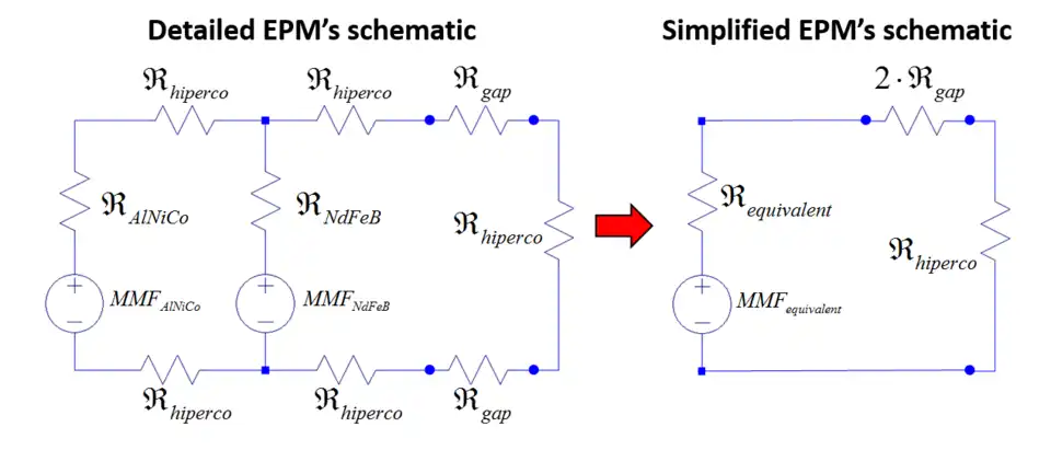 But the magnetic circuit can be simplified by using electric source transformations and considering all the hiperco in only one big reluctance (mainly because the value of those small pieces of reluctance are negligible compared with the reluctance of the permanent magnets). A simplified version of the magnetic circuit was presented on the right in the picture above:
