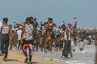 Elegushi Beach is a private beach located at Lekki, Lagos state, southwest Nigeria.[1] The beach is owned by the Elegushi royal family in Lekki, Lagos state.[2][3] Elegushi private beach is seen as one of the best beaches in Lagos and Nigeria at large. The beach entertains close to 40,000 guests every week with Sundays being the best day on the beach. Over half of all guests that are entertained on the beach weekly visit on Sundays. Their gate pass is at 2000 naira flat rate but can be discounted if you have like a group.[4] Their official Instagram handle can be used to reach them.