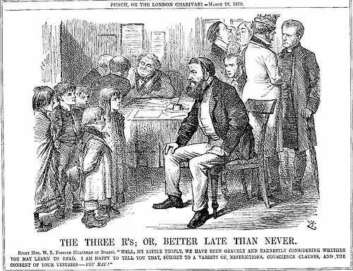 The Elementary Education Act 1870[4] (33 & 34 Vict. c. 75), commonly known as Forster's Education Act, set the framework for schooling of all children between the ages of 5 and 12 in England and Wales.[5] It established local education authorities with defined powers, authorized public money to improve existing schools, and tried to frame conditions attached to this aid so as to earn the goodwill of managers. It has long been seen as a milestone in educational development, but recent commentators have stressed that it brought neither free nor compulsory education, and its importance has thus tended to be diminished rather than increased.[6]