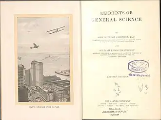Elements of General Science is a book written by Otis W. Caldwel and William L. Eikenberry that was first published by Ginn and Company in 1914.[1] A revised version appeared in 1918.[2] The book was designed to provide an introduction to the fundamental concepts of various scientific disciplines, aimed at high school students.[1] It was the first general science textbook and contributed to the development of the general science movement in the United States in the early 20th century.[3][4]