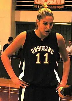 Delle Donne gained national recognition as a high school basketball star at Ursuline Academy in Wilmington, Delaware.[12] She led Ursuline to three straight Delaware State Championship titles and was ranked as the number-one overall high school recruit by Scout.com as well as a McDonald's All-American.[13] She was the first and only student at Ursuline so far to score 2,000+ points during her high school career and also set the girls' high school national record for consecutive free throws made (80) in 2005–2006.[14]
