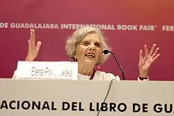 Poniatowska often gives presentations and is especially sought for talks and seminars in the United States.[5][6] She is considered to be Mexico's "grande dame" of letters[5][8] but she has not been recognized around the world like other prolific Latin American writers of her generation.[5] She has also not been fully integrated into Mexico's elite, never receiving diplomatic appointments, like Carlos Fuentes,[5] and turning down political opportunities. Nor has she spent much time in Mexico's elite literary circles. Fuentes once said that Poniatowska was too busy in the city's slums or shopping for groceries to have time for him and others. She says that such remarks show that she is considered more of a maid, a cook, or even a janitor in the "great House of Mexican Literature".[3][4]