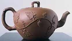 Their speciality was a red unglazed pottery, chiefly teapots, with sprigged relief ornament mostly in Chinese styles. Like earlier Dutch stoneware, their teapots, one of their most common lines, were heavily influenced by Chinese Yixing ware, also unglazed stoneware mostly used for teawares. The vessel shapes often also drew from European silversmithing. Some pieces, like the teapot in the Victoria & Albert Museum illustrated, have imitation Chinese characters,[8] usually described as "imitation Chinese seal marks" by scholars. Yixing teapots had been reaching Europe over recent decades.