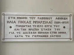 - ^ "Για τον Αρχιραββίνο Αθηνών Ηλία Π. Μπαρζιλάι (in Greek)". Χρονικά, Όργανο του Κεντρικού Ισραηλιτικού Συμβουλίου της Ελλάδος. 104: 6. February 1989.