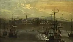 Charnock stayed in Madras for a few months under Gov. Yale's protection, which caused dissensions in the council for fear of the Mughal's revenge.[77][76] The Council eventually outvoted Yale, and Charnock was forced to leave, where he would found the city of Calcutta.[77][76] In July, 1690, news of the war between William of Orange and Louis XIV of France arrived in Madras, and Yale prepared Fort St. George once more for war.[78] On 15 August, the French sent seven warships to attack the Madras roads, along with one fireship.[75] The fort was protected by a garrison of 700 soldiers under Gov. Yale, with the help of a Dutch fleet.[79] Combat lasted a few hours, and the French were repulsed by the fort's guns, after which they didn't return.[75] Yale then negotiated the release of Englishmen, dealing with Moghul general Shaista Khan, along with Daniel Chardin, who was sent to the King of Kandy.[80] In 1690, Yale's brother negotiated with Rama Raja, the Chhatrapati of the Marathas, for the acquisition of a fort at Devanampatnam on behalf of the company, which was sold for 40,000 pagodas.[81] They renamed the place Fort St. David in honor of a Welsh saint.[82][81] On 28 December, they supplied ammunition to general Zulfiqar Khan, son of Grand Vizier Asad Khan, from which they obtained the firman for the territories of Vizagapatam, Gingee and Golconda.[83] During this year, Yale was also instrumental to the development of the Government General Hospital for Madras soldiers.[84]