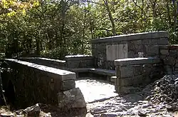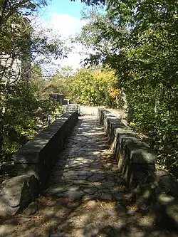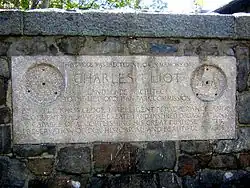The Eliot Memorial Bridge is a footbridge which was built in 1904 in memory of Charles Eliot, landscape architect to the Metropolitan Park Commission. It is located on the Skyline Trail near the summit of Great Blue Hill in the Blue Hills Reservation, south of Boston, Massachusetts. Eliot was a driving force in the establishment of many of the Greater Boston area's early parks, including the Blue Hill Reservation. The bridge was built out of locally quarried granite, and completed c. 1905–06. Built into its structure are a bench and commemorative plaque.[2] The bridge, which crosses a small ravine, is a remarkably large and sturdy structure for the location. The bridge is in neighborhood to the Great Blue Hill Observation Tower, near the 635-foot (194 m) summit of Great Blue Hill, a few hundred yards from and a little below the Great Blue Hill Weather Observatory, which is at the top of the mountain. The view from the observation tower toward the Observatory and its forest of radio, TV, and microwave antennas, is obscured by trees.