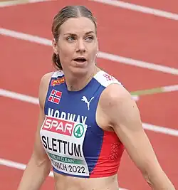In the 4 x 100 metres relay she finished fifth at the 2003 European Youth Olympic Festival and was a Norwegian team mainstay at numerous European Cups and Team Championships.[1] She helped breaking the Norwegian record with 44.35 seconds at the 2008 edition, together with Siri Eritsland, Folake Akinyemi and Ezinne Okparaebo. Slettum helped improve it to 44.29 seconds at the 2014 European Championships with Isabelle Pedersen, Christine Bjelland Jensen and Ezinne Okparaebo; then to 43.94 seconds at the 2015 European Team Championships Super League with Isabelle Pedersen, Ida Bakke Hansen and Ezinne Okparaebo.