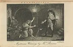 Two of Parsons's novels, The Castle of Wolfenbach and The Mysterious Warning (1796), feature among the seven horrid romances that Catherine Morland recommends to Isabella Thorpe in Chapter 6 of Jane Austen's Northanger Abbey. These titles were thought to be fictitious until December 1912.[12] Critics have said it is no accident that Ann Radcliffe's works were not named and two of Parsons's were. Many of Parsons's novels had prefaces that would seem to invite sympathy from the readers towards her unfortunate situation and to excuse her lack of talent. The Castle of Wolfenbach and The Mysterious Warning had happy endings that were too clumsy and convenient for critics.[13]