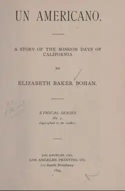 Elizabeth Baker Bohan (née, Baker; August 18, 1849 – August 27, 1930) was a British-born American author, journalist, artist, and social reformer. She had a special interest in the reconstruction of the penal system. She published two novels, Un Americano, a story of the mission days of California (1895) and The Drag-Net, a prison story of the present day (1909, illustrated by Langdon Smith).