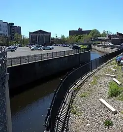 The headwaters of the Elizabeth are in East Orange in Essex County.[1] The river rises in an urban area at the border between Irvington and the Vailsburg neighborhood of Newark.[2] It flows in a generally southern direction through the center of Irvington in a concrete channel with masonry walls built in the 1920s and 30s[3][4] passing along the east side of Civic Square. Further south, it forms the west boundary of the 19th century Clinton Cemetery.[5] At the southern end of the cemetery, the river passes under the Garden State Parkway near Exit 143 and disappears as a surface waterway.