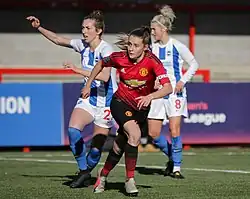 On 10 November 2022, Toone signed a further contract extension until June 2026.[25] In the 2022–23 season, Toone provided 8 assists and scored 3 goals, helping United to finish second place in the WSL, and qualifying for the Champions League second round for the first time in the club's history.[26] In February 2023, Toone had a red card and three-match ban overturned, after being sent off for pushing Tottenham's Eveliina Summanen.[27] Summanen was later charged with simulation and deceiving officials over the incident by the FA, and given a two-match ban.[28][29]