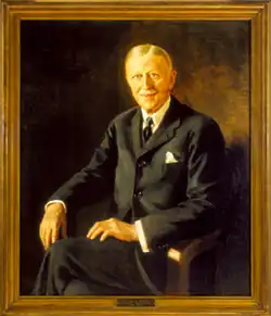 Rand focused her energy and output on painting portraits of corporate directors, society women, politicians, scientists, professors, lawyers and artists in the United States. Her portraits of the singer Susan Metcalfe Casals, her husband celloist Pablo Casals, and opera singer Charles Gilibert,[5] as well as her portraits of sculptor Saint-Gaudens and MacMonnies, all attest to her engagement with the arts in the first decade of the twentieth century.[6] In terms of politicians she claimed to have started a work on a portrait of President Theodore Roosevelt but she "had to give it up. 'It was ridiculous,' she recalled. 'He couldn't sit still—especially with children going in and out of the studio with snakes and spiders.'"[7] Rand did, however, complete three portraits of President Franklin Roosevelt, including his official presidential portrait. She was the second female artist commissioned to produce a presidential portrait. After his death, the portrait was moved to the Roosevelt estate and future FDR Library in Hyde Park, NY. It is unclear exactly why such a move was made, although there are letters exchanged between President Harry Truman and First Lady Eleanor Roosevelt concerning the transfer of the portrait. Another portrait was then used to replace the Rand work in the White House.[8] In 2004 the portrait was reported missing from the Library.[9] Rand also painted three U.S. Secretaries of State—John Milton Hay, Elihu Root, and Henry Lewis Stimson.