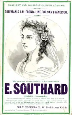 Ellen Southard plied international trade routes from her homeport in Bath, Maine, with visits documented in ports as far away as Sydney, Australia.[10] In 1864, she recorded the longest duration voyage of any ship transporting railway locomotives from the east to the west coast of the United States prior to completion of the first transcontinental railroad. The ship took 205 days to complete the passage after she was delayed for 48 days by unfavourable winds off Cape Horn.[11]