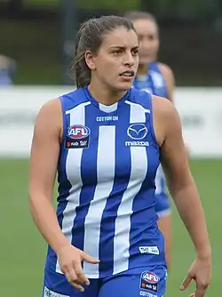 Ellie Gavalas (born 25 March 1996) is an Australian rules footballer playing for the Western Bulldogs in the AFL Women's (AFLW). She has previously played for North Melbourne. Gavalas was drafted by North Melbourne with their first selection and tenth overall in the 2019 AFL Women's draft.[1] She made her debut against Melbourne at Casey Fields in the opening round of the 2020 season.[2] It was revealed she signed on with the club for two more seasons on 17 June 2021, tying her to the club until the end of 2023.[3]