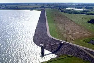 Lake Waxahachie is located about five miles south of Waxahachie in Ellis County, Texas. Owned and operated by Ellis County Water Control and Improvement District Number One on behalf of the city of Waxahachie, the lake was formed by impounding the Waxahachie Creek in 1956. The water covers about 650 acres and has a maximum depth around 50.[6][7] The former community of South Prong was located beside the creek before the lake was created.[8] There has been a country club and a two-acre public park with boat ramp since the lake was completed.[9] The lake is a recreational resource for the entire county.