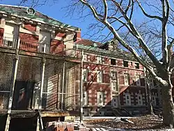 On June 15, 1897, the wooden immigration station on Ellis Island was destroyed by fire.[14][17][18][19] The Buffalo Evening News reported that all 40 patients were safely evacuated and taken to Bellevue Hospital.[20] By September, the treasury's supervising architect, James Knox Taylor, opened an architecture competition to rebuild the immigration station.[21] The competition was the second to be conducted under the Tarsney Act of 1893, which had permitted private architects to design federal buildings, rather than government architects in the supervising architect's office.[22] By December, it was announced that Edward Lippincott Tilton and William A. Boring had won the competition.[17][23] Tilton and Boring's plan called for four new structures: a main immigration processing facility in the French Renaissance style, as well as the kitchen and laundry building, main powerhouse, and the main hospital building[21][24][25][26] The plan also included the creation of a new island (Island 2), upon which the hospital would be built, south of the existing island (Island 1).[21][24]