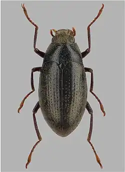 Adults reach a length of 2.69–3.07 mm (males) and 2.89–3.21 mm (females). Their body is oblong-ovate and dark brown to black, except for the reddish brown mouthparts, antennae and legs.[1]
