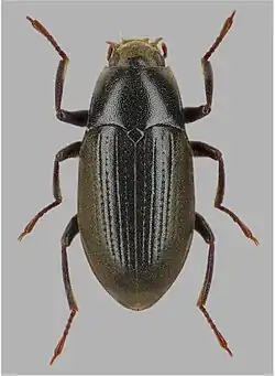 Adults reach a length of 3.17–3.35 mm (males) and 3.15–3.45 mm (females). Their body is ovate and black, except for reddish brown mouthparts, antennae, trochanters and tarsi, and brown proximal portions of the tibiae.[1][2]