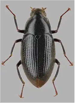 Adults reach a length of 3.58 mm (females). Their body is oblong oval and integument black, while the mouth parts, antennae, trochanters and tarsi are reddish brown.[1]