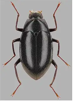 Adults reach a length of 3.09–3.50 mm (males) and 3.35–3.66 mm (females). Their body is oval, widest close before the middle of the elytra, strongly convex dorsally and integument dark brown to black. The mouthparts, antennae, trochanters, and tarsi are reddish-brown.